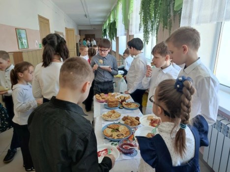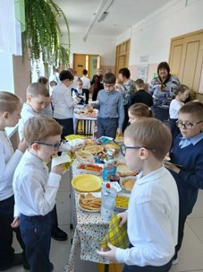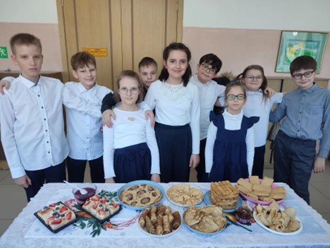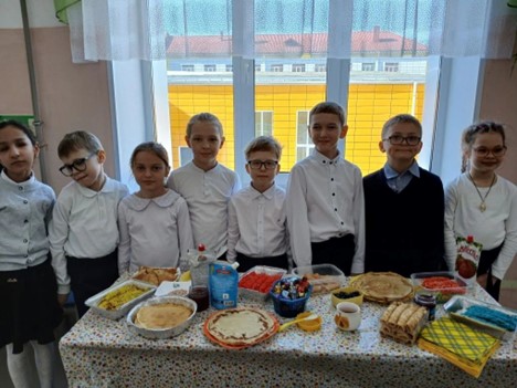 В первый день Масленицы учащиеся начальной школы вместе со своими родителями и классными руководителями пригласили всех желающих на ярмарку- дегустацию. Своим разнообразием ярмарка могла поразить самого требовательного кулинара, поскольку такого удивительного ассортимента не встретишь ни в одном заведении общественного питания.