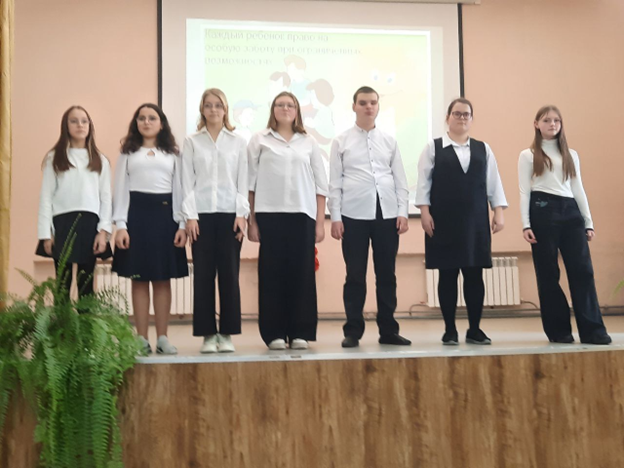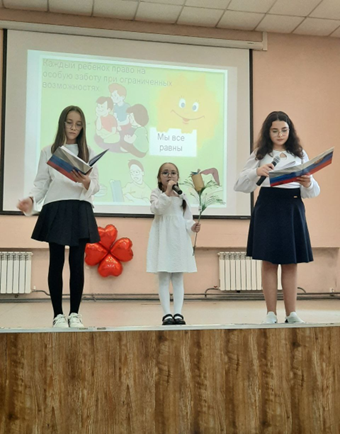 В актовом зале состоялся концерт, посвященный Дню инвалидов. Это было очень доброе, теплое и талантливое выступление наших учащихся. И ведущие Эвелина К. и Лиза Ш. и девочка Женя с цветиком-семицветиком в исполнении Вероники М. говорили о том, что доброта и взаимопомощь помогут исполнению мечты, что люди с ограниченными возможностями здоровья имеют право на полноценную жизнь и достижения своих высот во многих видах деятельности.