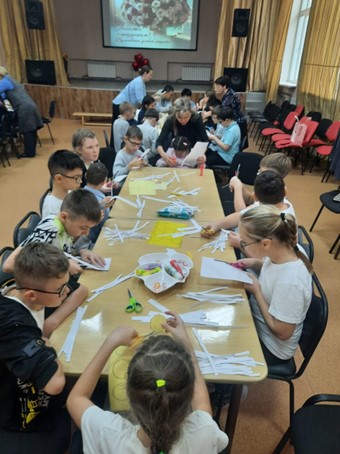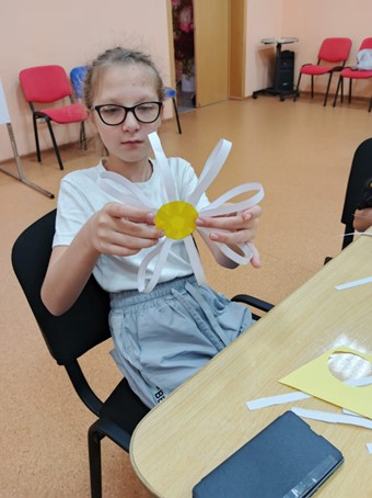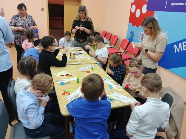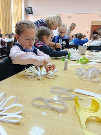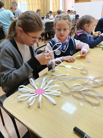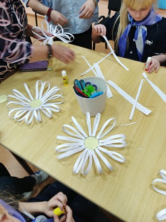 Учащиеся начальной школы с большим желанием и заинтересованностью участвовали в мастер-классе, старательно вырезали будущие лепестки, приклеивали их к сердцевине. Каждый ребенок стремился изготовить свою ромашку, чтобы потом подарить её маме.