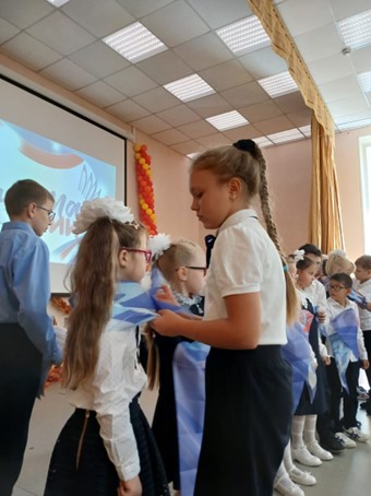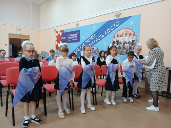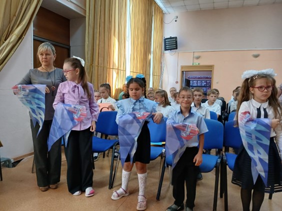 Ребятам повязали галстуки с эмблемой движения и вручили значки, а первоклассники произнесли клятву, где пообещали быть достойными членами организации.