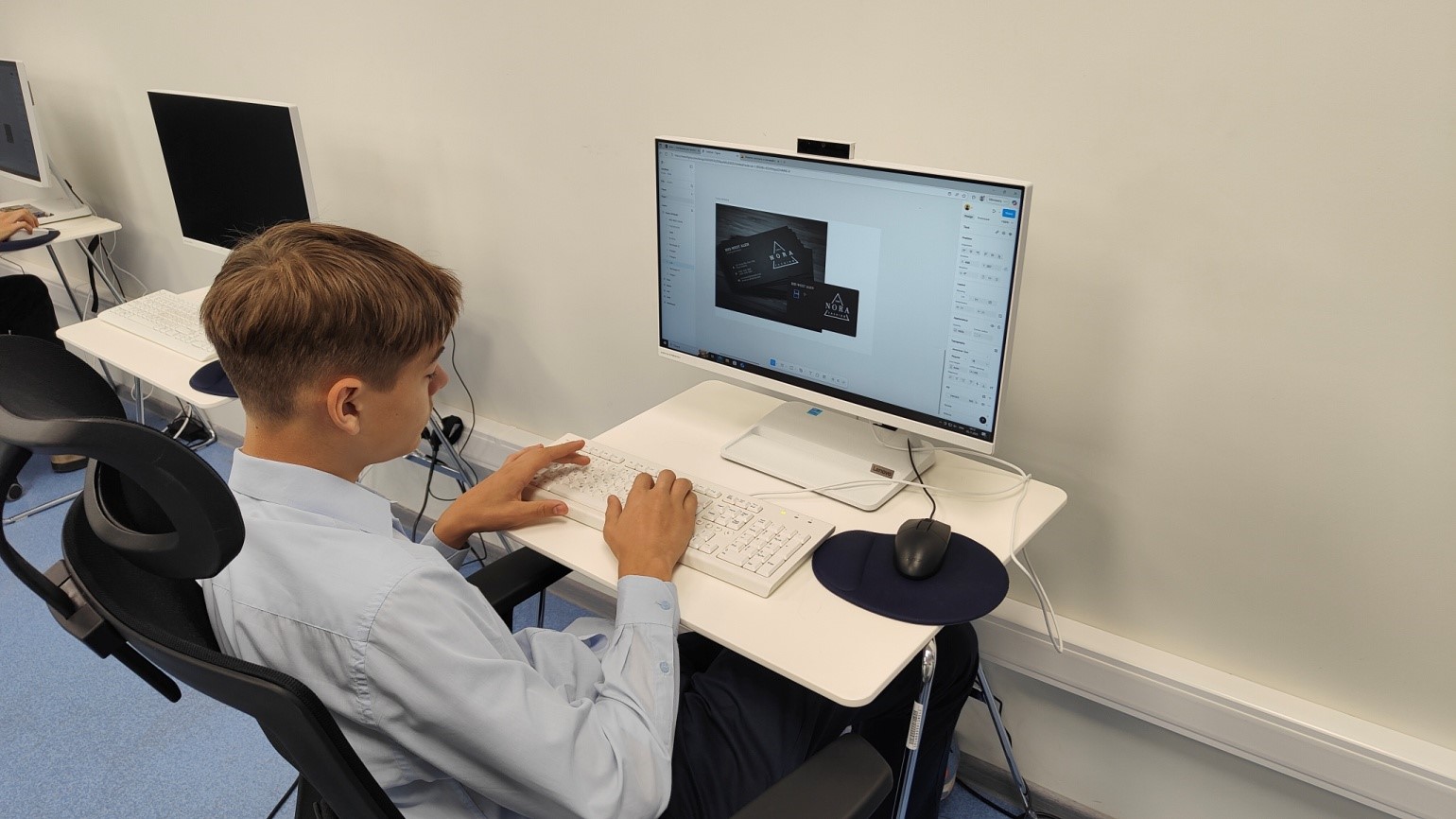 После теоретической подготовки ребята перешли к самому интересному — практическому заданию. Их задачей стало создание собственной визитной карточки в специализированной компьютерной программе. Участники, осваивая интерфейс профессионального софта, воплощали свои творческие идеи в цифровом формате.